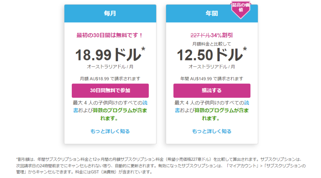| プラン | Reading(読書のみ) | Reading&Maths(読書+算数) |