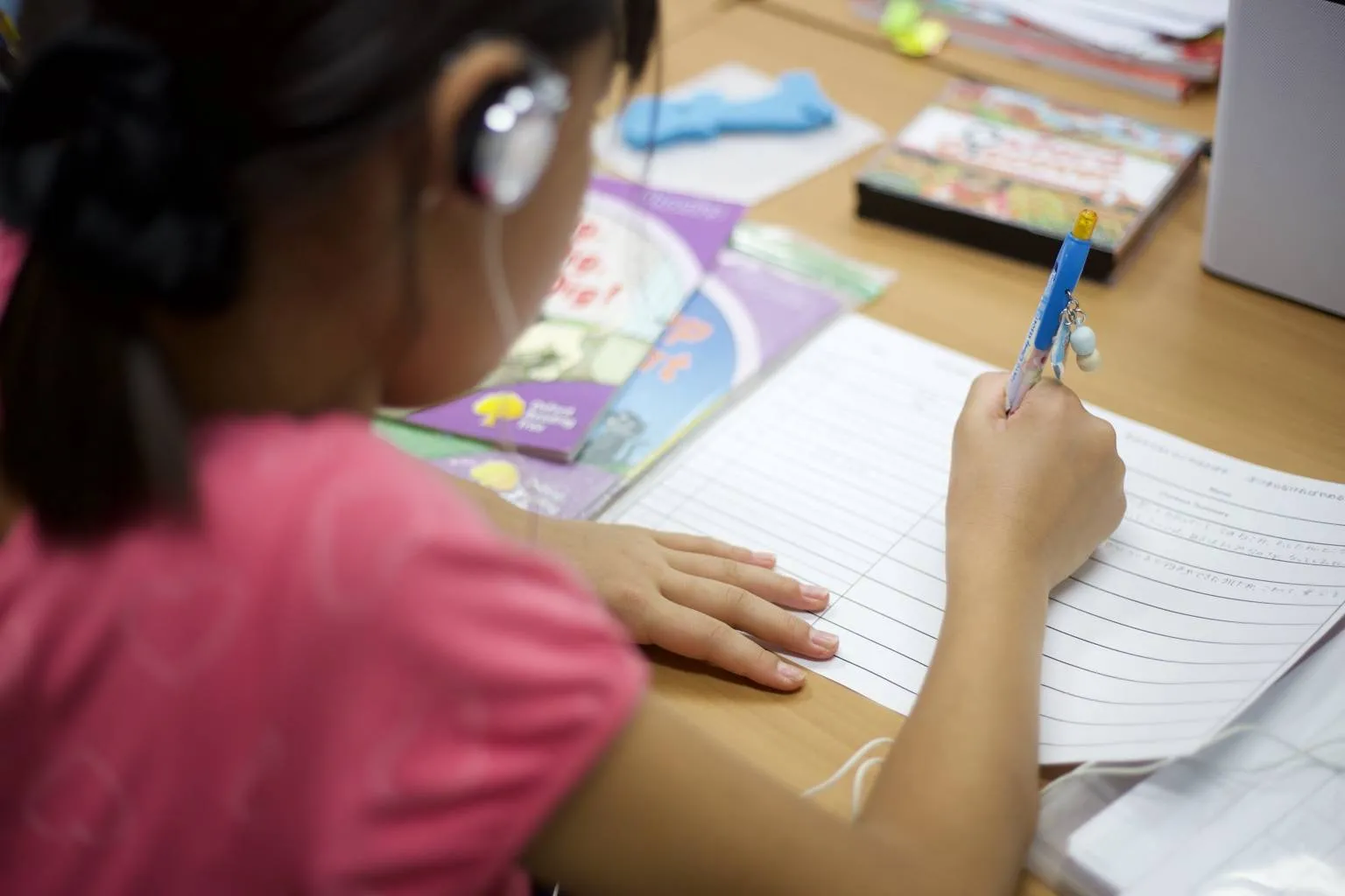 読み終えた後は講師が音読チェックと内容の質問を行い、理解度を確認します。その後、生徒さんたちは多読ログというノートに、読んだ本のタイトルや語数、要約、感想を書き込んでいました。こうして積み重ねた読書の記録が、自信につながっていくのですね。