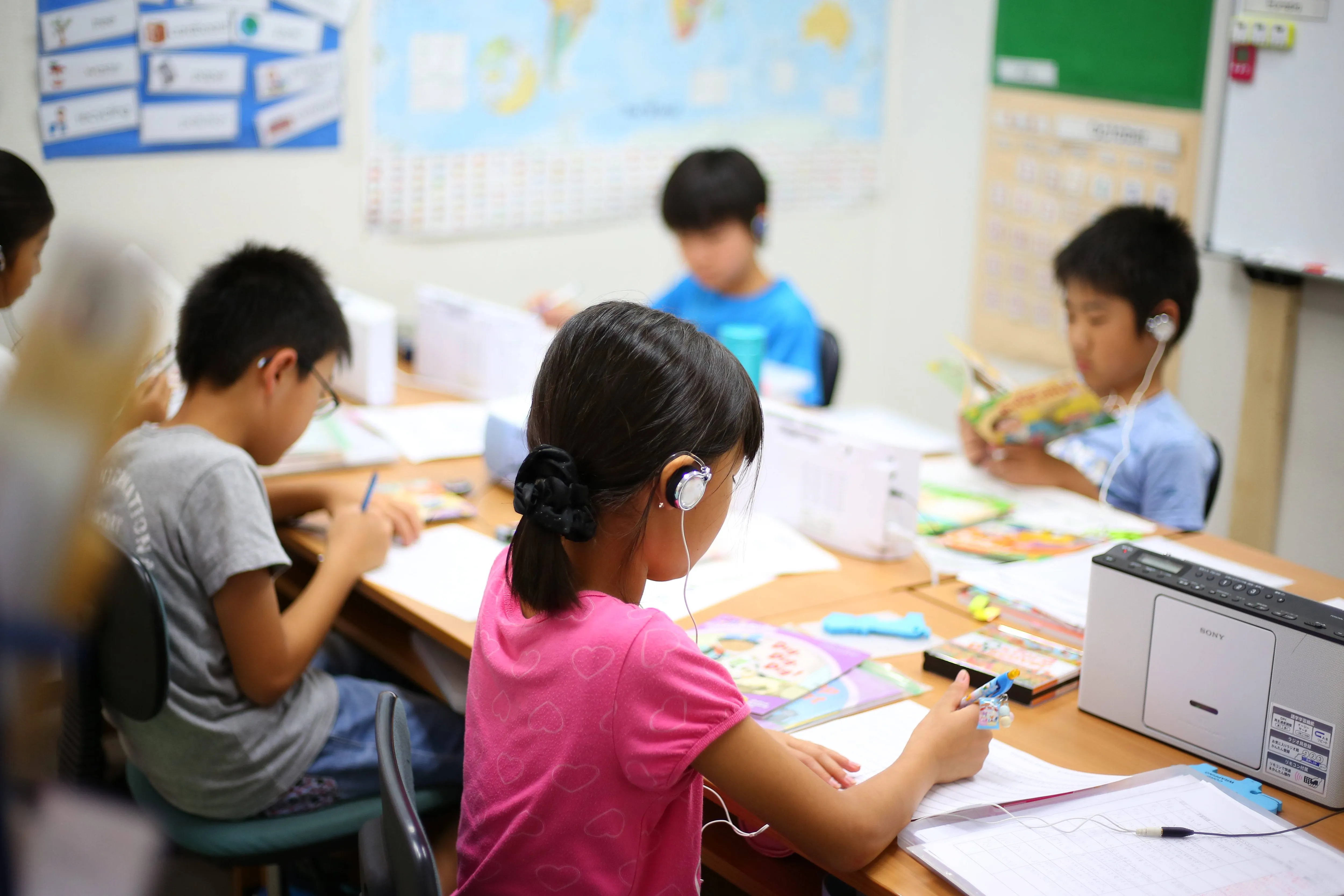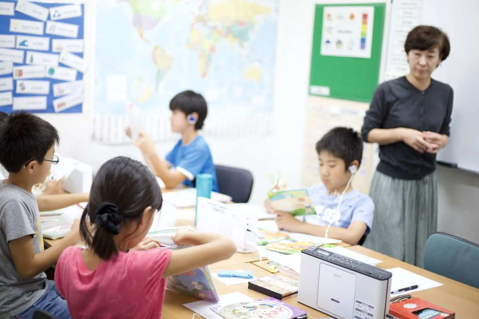 レッスンの最後は、多読多聴の時間です。各自が机の上のCDプレイヤーで選んだ本の音源を聴きながら、3回繰り返して読み込みます。最初は音声に合わせて文章を目で追い、次は声に出して一緒に読み、最後は自分ひとりで音読することで、正しい発音とリズムを身につけていました。