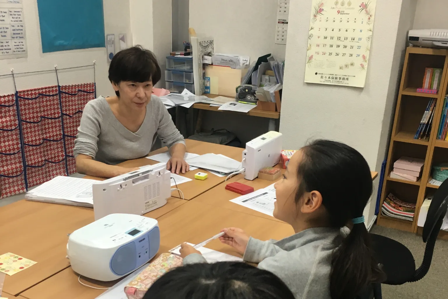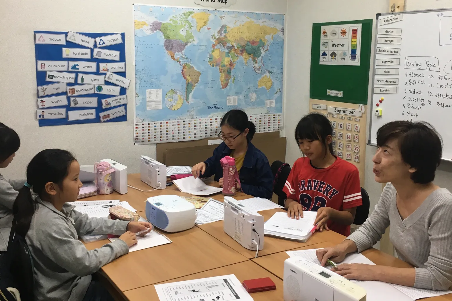 そんなウォーミングアップが済んだところで、いよいよ本格的に授業がスタート。みんな集中して単語テストに取り組みます。単語は家で練習してくるお約束。生徒のレベルに合わせて1週間に覚えてくる単語の数は10個だったり20個だったりします。