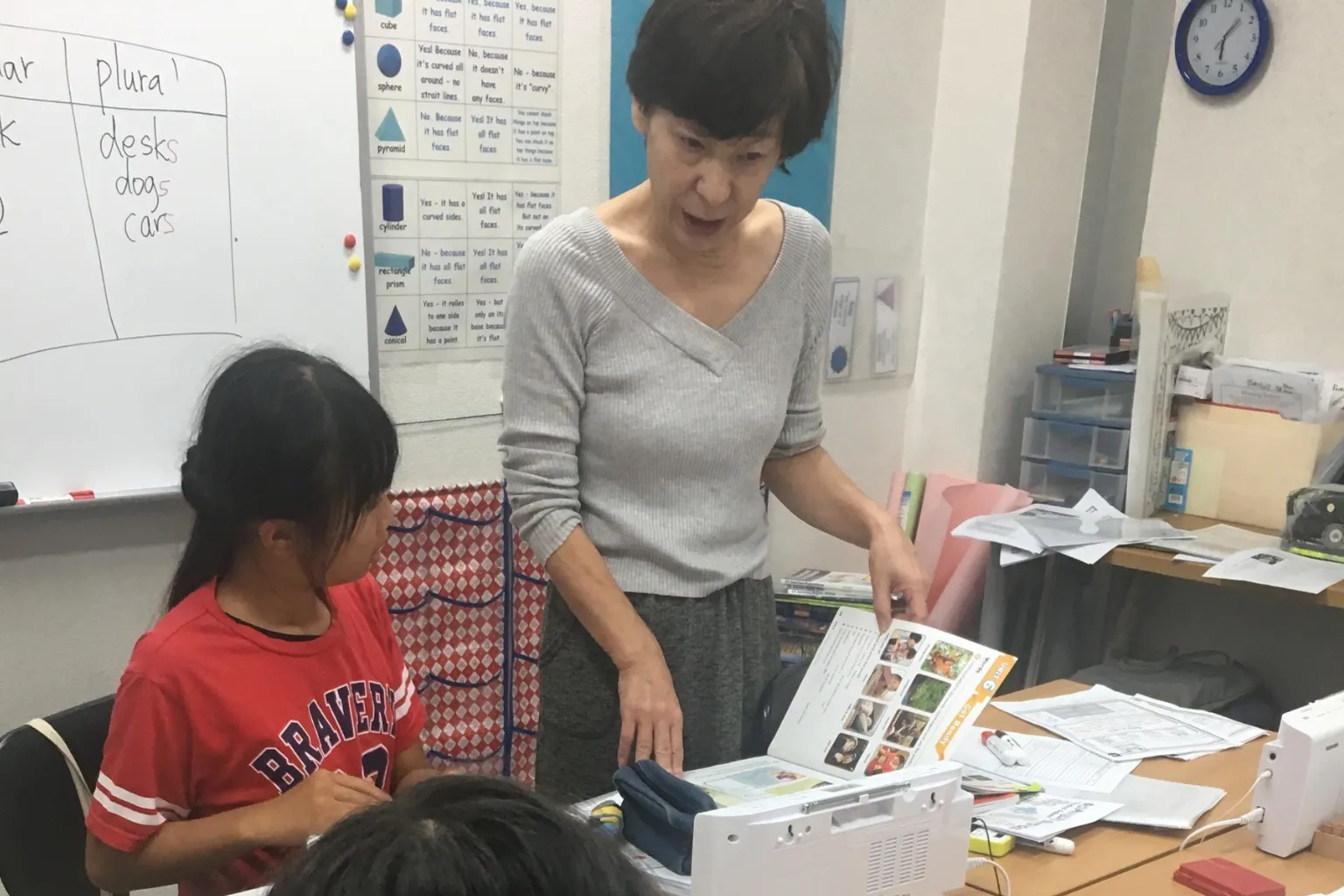 教室に入ってきた生徒に対して、先生が元気よく声を掛けます。問いかけに対して、生徒のテンションはさまざま。ちょっと遅れて来た子に対しても、先生の対応は変わらず笑顔。そんなラフな雰囲気でスタートするのが小学生のクラスです。席に着くと軽い雑談から授業が始まります。もちろん、全て英語です。